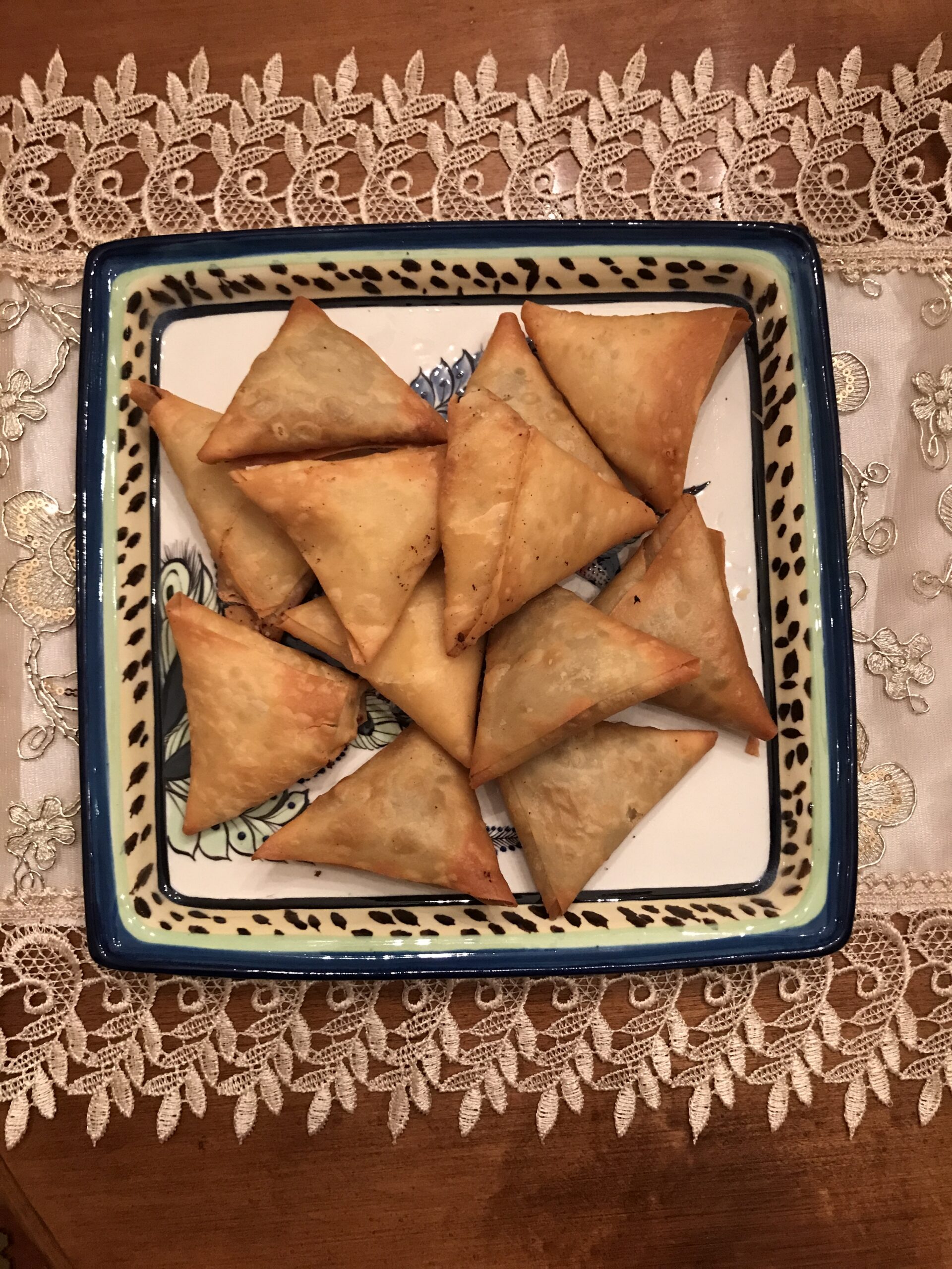 A crispy, flaky phyllo dough pocket filled with minced beef, cheese, or a mix of vegetables. (Contains Wheat)